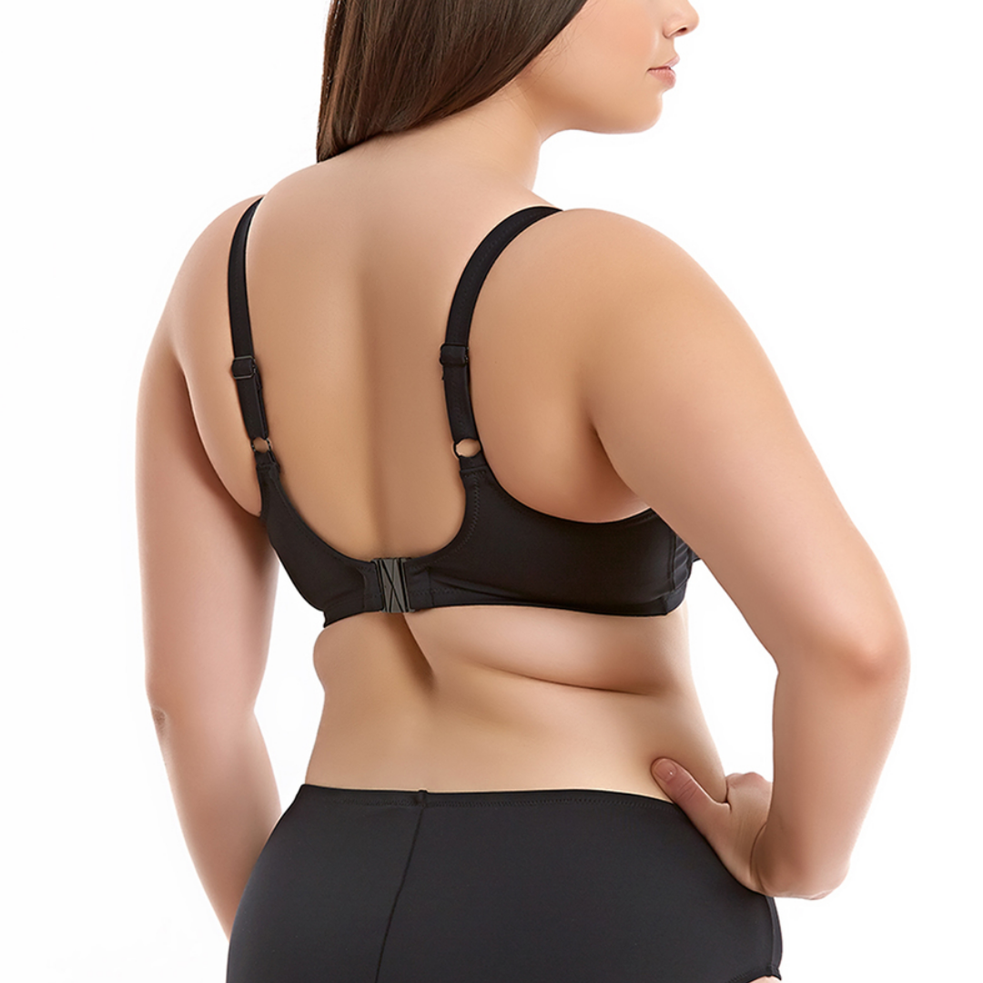 - Three piece cups plus side support panel for forward shape, uplift and separation